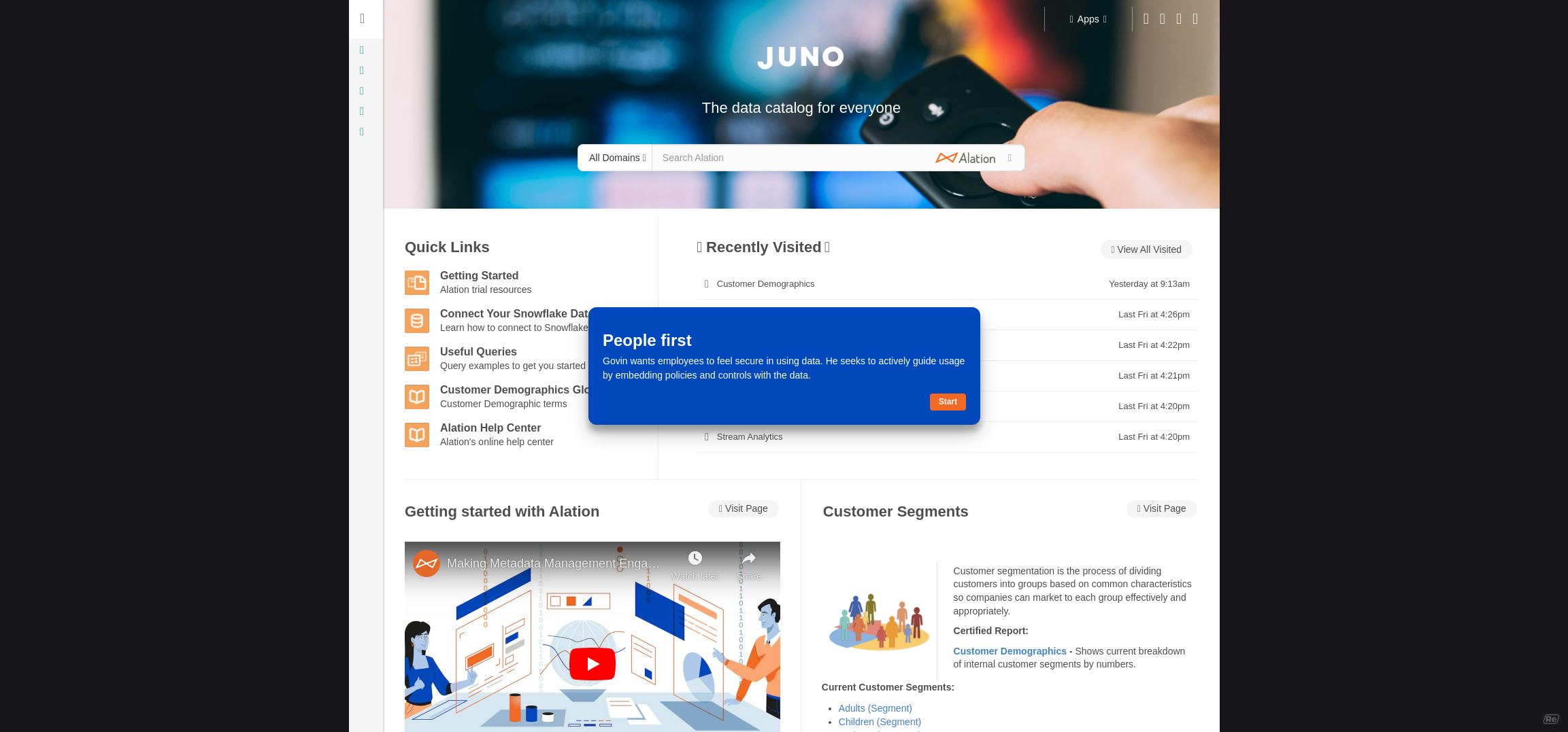 Alation offers enterprise data intelligence solutions, including data search & discovery, data governance, data stewardship, analytics, and digital transformation. Alation operates in the data catalog market. With its Behavioral Analysis Engine, inbuilt collaboration capabilities, and open interfaces, Alation combines machine learning with human insight with the goal of tackle the most demanding challenges in data and metadata management.